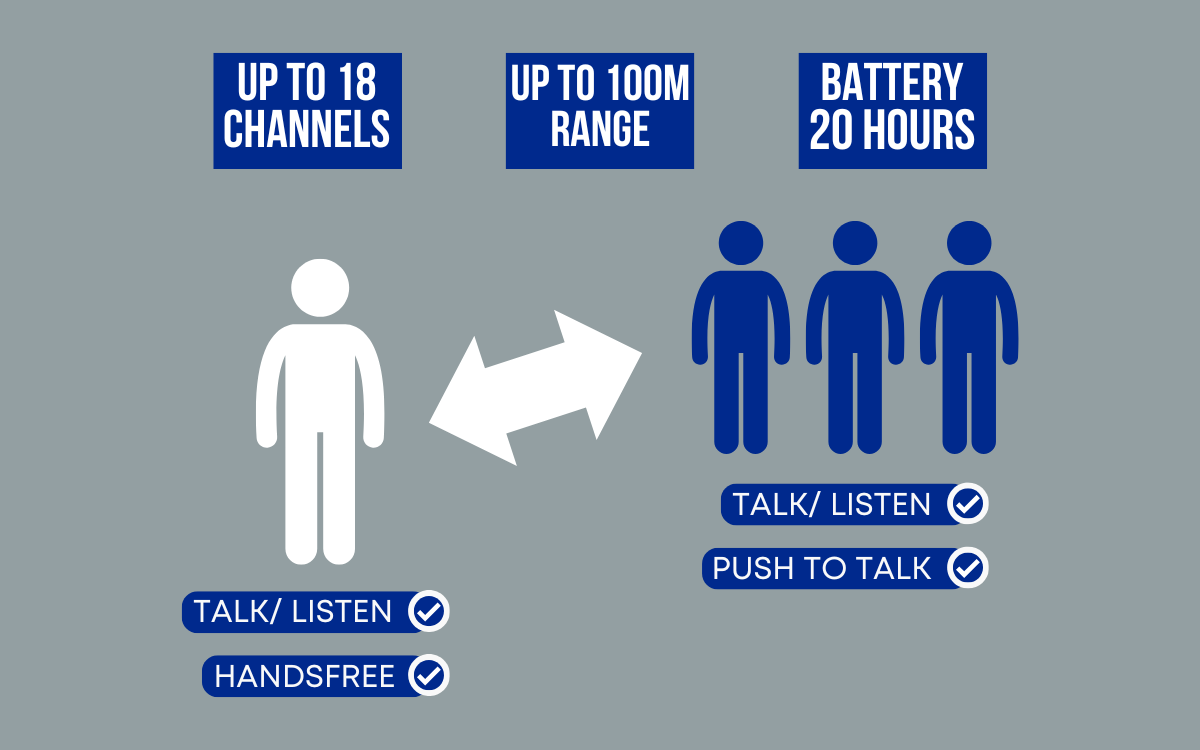 A 2-way tour guide system allows for two-way communication, both the presenter and guests can talk. The presenter uses a push-to-talk transmitter device which has a tie-clip or headband microphone and earphone connected to talk and listen. The guests use a push-to-talk receiver device which has a built-in microphone and earphone. These high-quality devices have a range of up to 100 metres and can be used for up to 20 hours. They run on internal rechargeable lithium-ion batteries. The system can support multiple groups across up to 18 channels.
