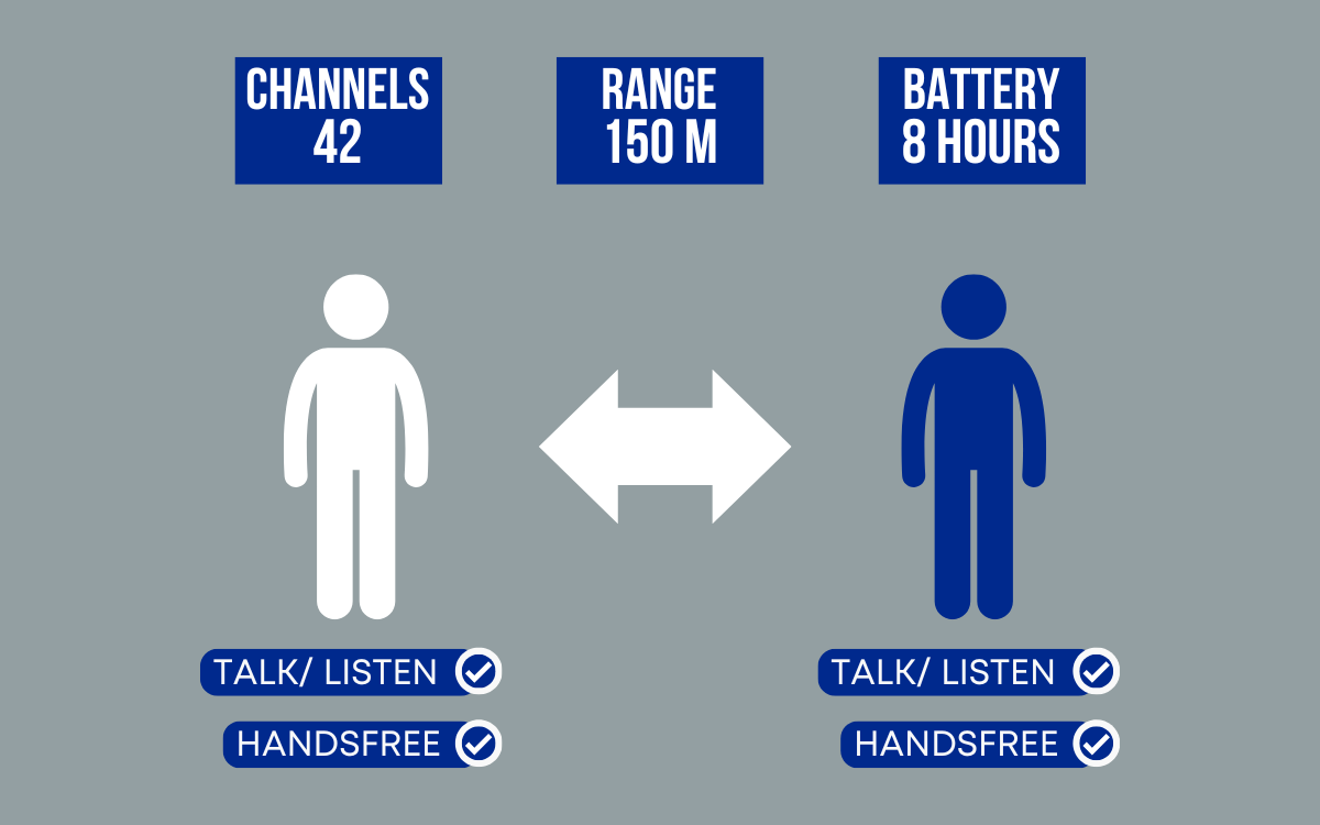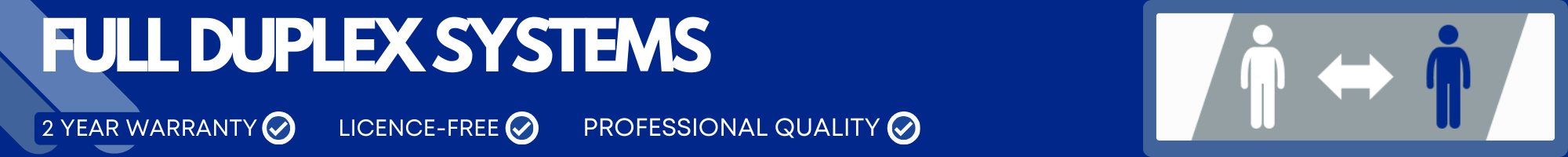 A full duplex tour guide system allows for continuous two-way communication between two people. Each has a transmitter device with an earphone microphone connected which is used talk and listen. There is no push-to-talk button to activate speech making this system ideal for many applications which require handsfree communication. These high-quality devices have a range of 100 metres and can be used for up to 8 hours. They run on standard or rechargeable AA batteries.